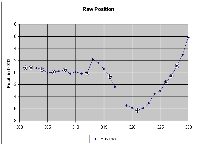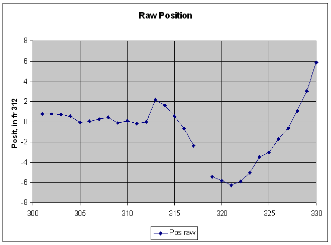 frames in the major rearward lurch (314 through 317) are remarkably regular.