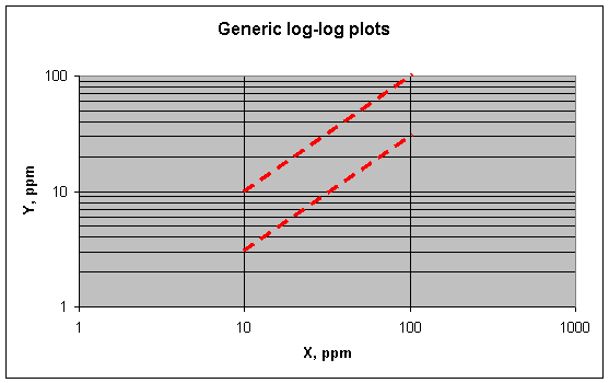= aX, shows up like this on a log-log plot. The upper line is Y = X (i.e., a =